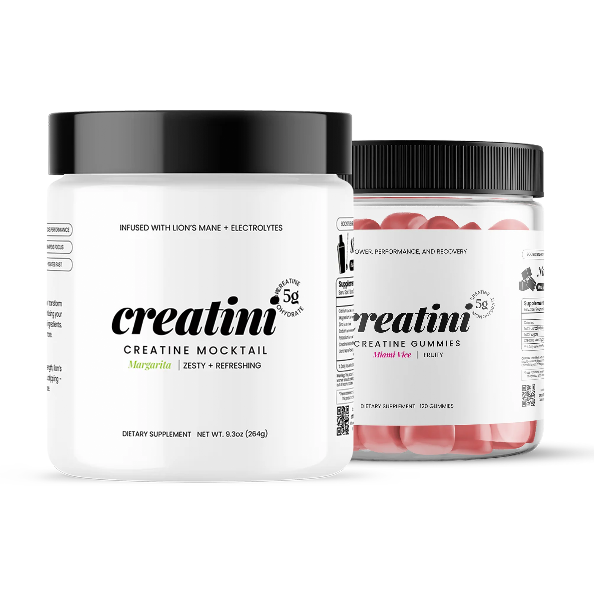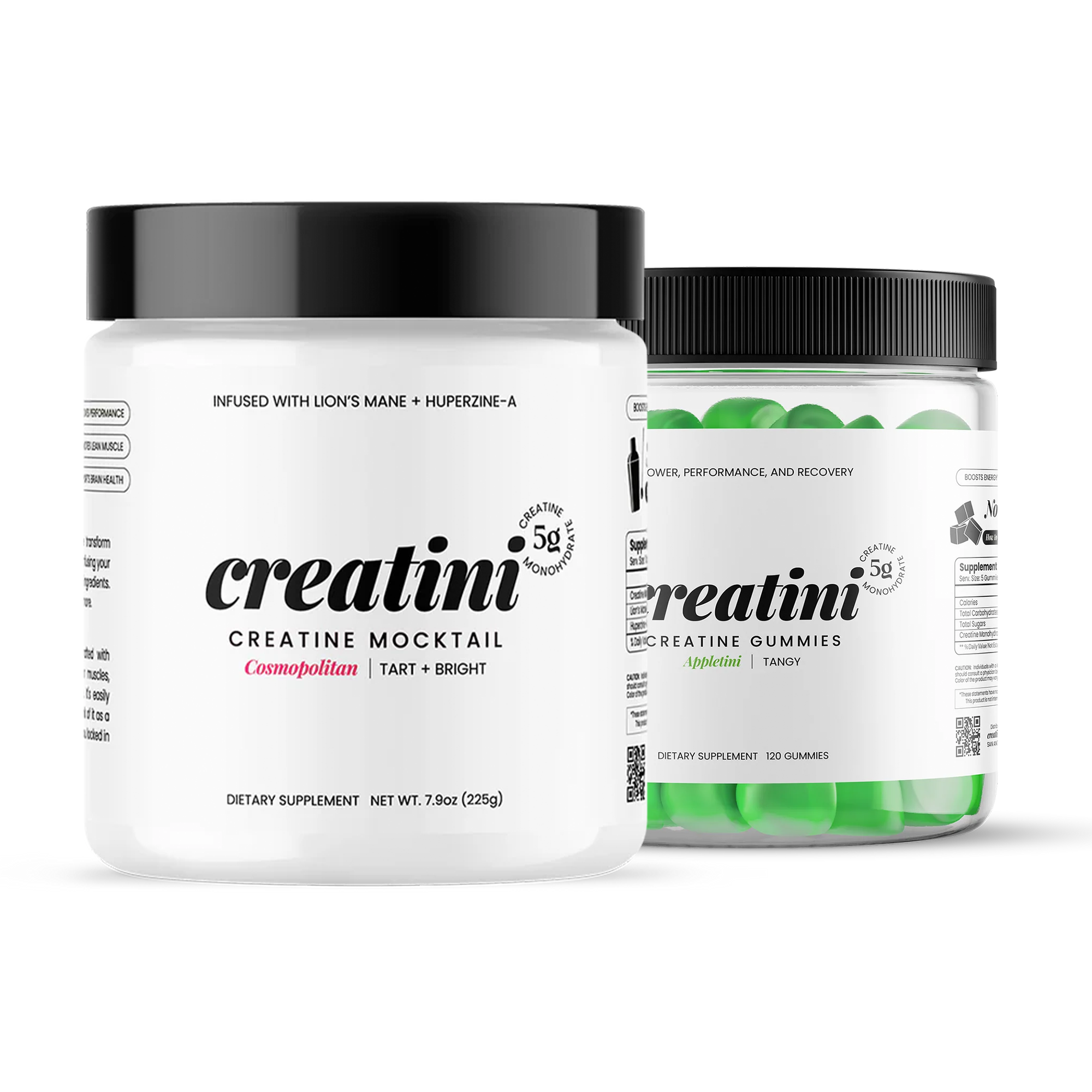 The Power Couple Bundle is made for our Lifters. Creatini Cosmopolitan Mocktail will help with optimum focus in the gym using Huperzine-A and Lion's Mane as your nootropic boost for better focus and clarity. For rest days and a sweet treat, chew on our Creatini Gummies to fuel your daily creatine intake.